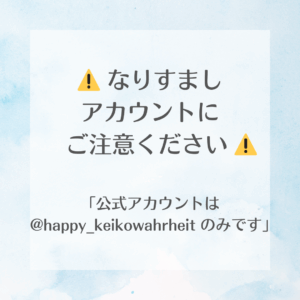 • 「⚠️ なりすましアカウントにご注意ください ⚠️」と大きく表示 下に「公式アカウントは @happy_keikowahrheit のみ」